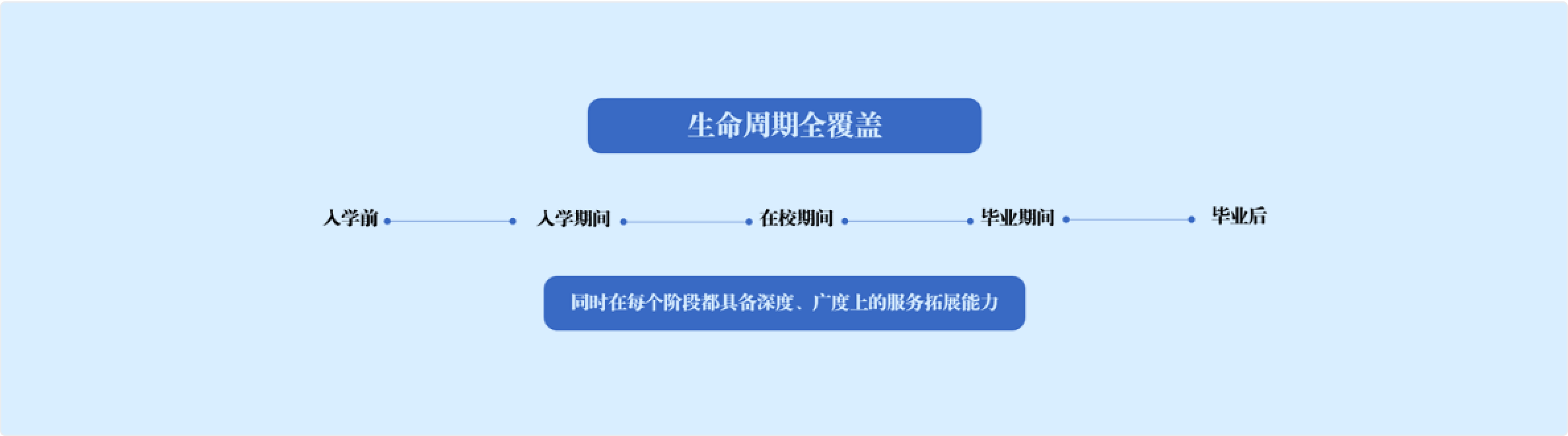 面向學(xué)生的全生命周期的服務(wù),涵蓋學(xué)生入學(xué)前,入學(xué)期間,在校期間,畢業(yè)期間,畢業(yè)后階段,同時(shí)在每個(gè)階段都具備深度、廣度的服務(wù)拓展能力