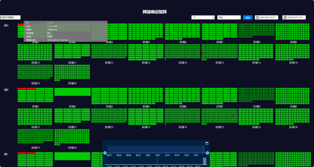 基于分布式Agent探針,采集全局網(wǎng)絡(luò )質(zhì)量指標,如子網(wǎng)存活、響應時(shí)延、丟包率、丟包明細等關(guān)鍵指標,以矩陣形式直觀(guān)展現。